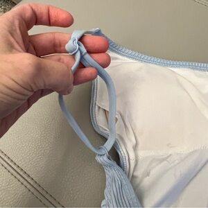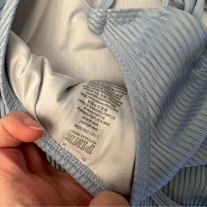 Light blue ribbed one piece with lace up details on both sides. Lightly lined/removable padding with low back, adjustable straps and high cut leg.