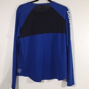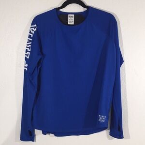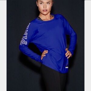 Made from their ULTIMATE material so it’s super sweat absorbent and flattering on. The material is breathable and cool against skin, mesh back design. Thumb holes. The color is blue. Pink logo on the sleeves.