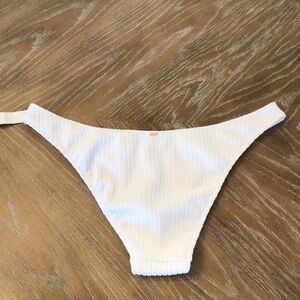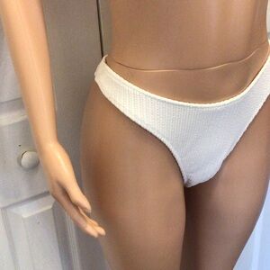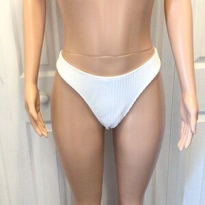 Pink Victorias Secret White Ribbed High Cut Cheeky Brazilian Bikini Bottom Size XXL. New with tags and hygiene liner. From smoke free home. *top not included. Hygiene liner may have collected a little dust/fuzz on sticky part from being in bin with other pieces.
