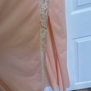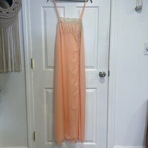 Gorgeous pale pink lace-trimmed empire waist vintage maxi slip with a slit and adjustable straps! Size S, true to size in my opinion or a bit big. Gently used condition, no flaws that I can see just don’t love the color on me personally. Brand was cut out of the tag for some reason but looks like Wonder Maid to me.