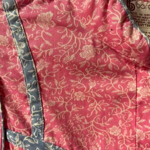 Labeled a size small, it fits more like a Medium and has snaps all the way down the front. 100% cotton, made in Sri Lanka.