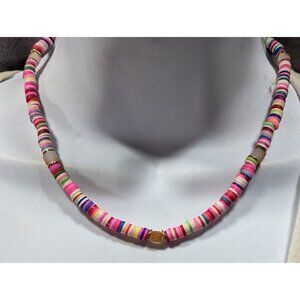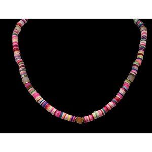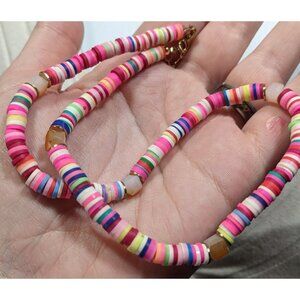 This vibrant pink vinyl disc beaded necklace features stunning faceted glass accents, adding a touch of elegance to any outfit. Perfect for casual or formal occasions.