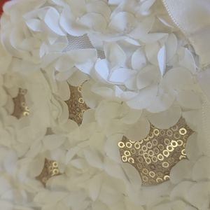 Embellished with white cloth flowers and bronze sequins