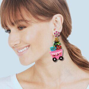 Pink Wagon Piled Presents Holiday Rhinestone Bling Seed Beaded Party Earrings