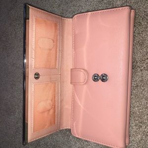 - pink - 2 id slots - coupons, receipts, & cash pockets - 2 zippered areas - 13 card pockets - 2 hidden pockets under card holders