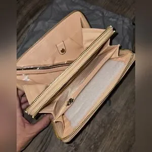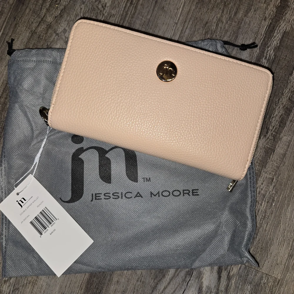 Jessica Moore Wallet Large Double Zippered Wallet includes 18 card slots, a zippered coin pouch, lipstick holder and additional storage. Includes a wristlet strap.