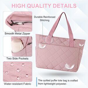 Features: Made from durable water-resistant polyester, this puffer tote has a trendy quilted design that’s lightweight yet spacious. Reinforced handles and a wide shoulder strap keep it comfy and sturdy all day. It easily mixes and matches with both casual and work outfits, making it versatile for any occasion.