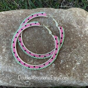 Here’s a pair of Pink Watermelon 2” Beaded Hoops that are lightweight and comfortable to wear all day long. Made with high quality glass Delica Beads, beaded one bead at a time. Love and passion goes into making my jewelry. This process requires focus, patience and dedication. Each bead is 16th of an inch and can take hours to complete a project.