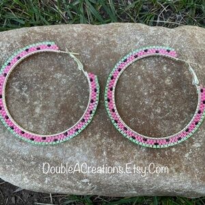 Pink Watermelon 2” Beaded Hoops, New, Handmade by Me