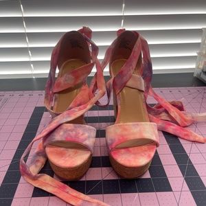 Pink and purple watercolored wedges with fabric straps. You can tie them all the way up your calves or just at your ankles. Only worn for a photoshoot. Like New!