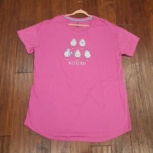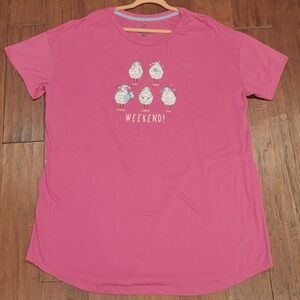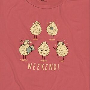 Fun pink t-shirt with a playful 'Weekend!' graphic. Perfect for casual outings.