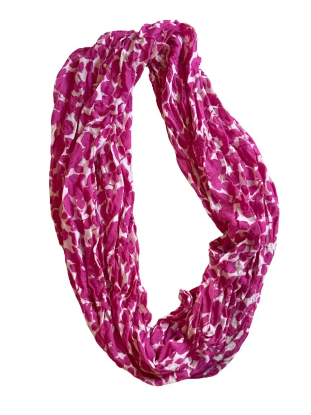 Soft infinity scarf with an abstract pink and white print. Lightweight, breathable fabric designed to be looped twice around the neck. A versatile accessory for casual wear. Excellent pre-owned condition.