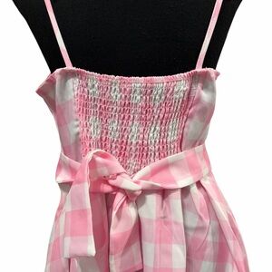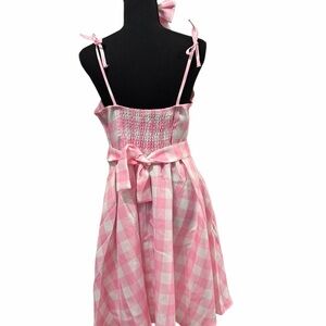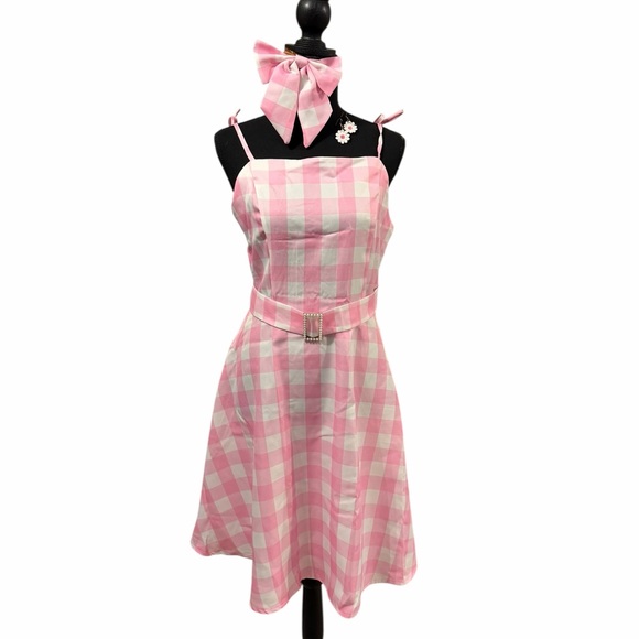 Pink & White Checkered Barbie Dress Costume with Bow Belt & Earrings size L