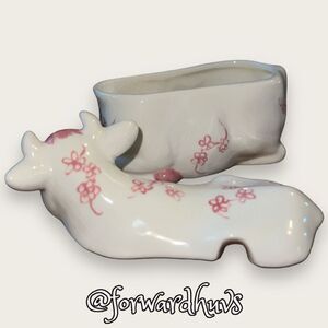 This is a beautiful pair of porcelain cow sugar & creamer pieces that are white with a delicate pink floral pattern. This is a 3 pc. set which includes the creamer, sugar jar and lid (cow body and cow top). This does not include a sugar spoon for the sugar set but can easily be replaced.
