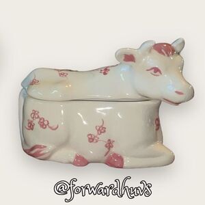 This is a beautiful pair of porcelain cow sugar & creamer pieces that are white with a delicate pink floral pattern. This is a 3 pc. set which includes the creamer, sugar jar and lid (cow body and cow top). This does not include a sugar spoon for the sugar set but can easily be replaced.