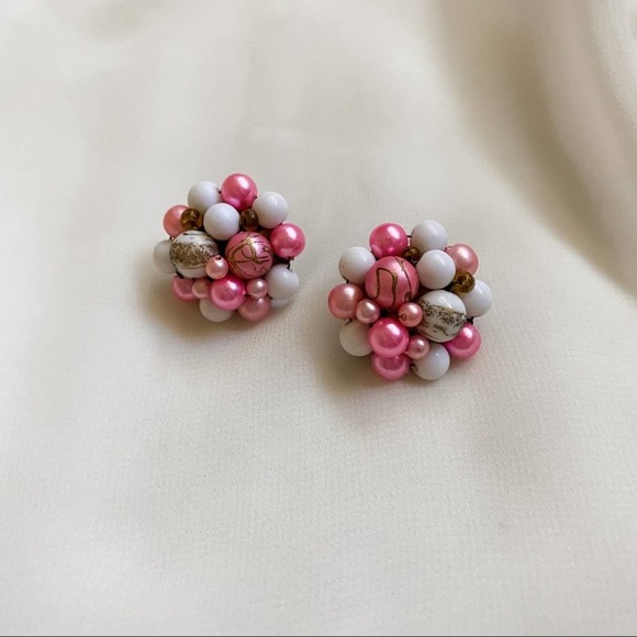 Pink White Gold Swirl Cluster Pearl Clip Earrings