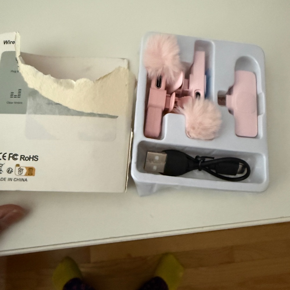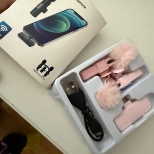 Wireless microphone set in pink. Includes USB C cable and two microphones with fluffy covers.
