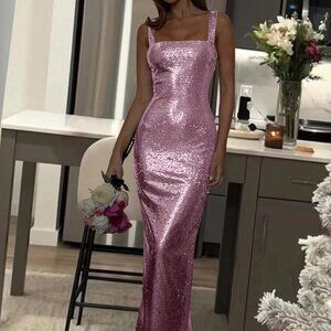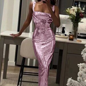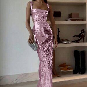 Pink Women'sSquare Neck Fishtail Backless Sleeveless Metallic Sequin Dress