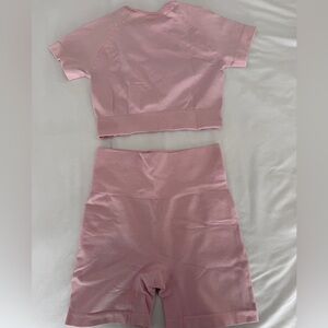 Stylish pink athletic crop top and shorts set. Perfect for workouts or casual wear.