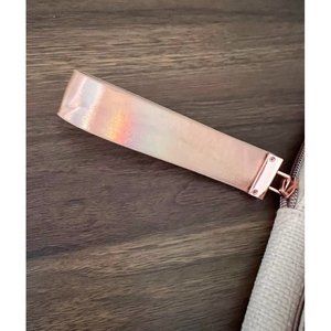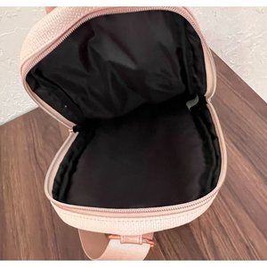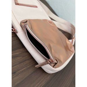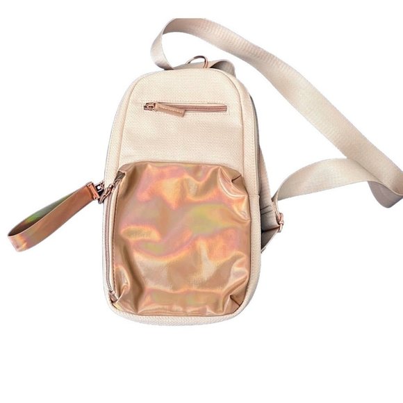 Pink Rose Woven Holographic Mini Crossbody Backpack Bag. Excellent used condition. 13 1/4" X 8" X 2 1/2" with 26 1/2" to 45 1/2" adjustable strap. Excellent used condition.