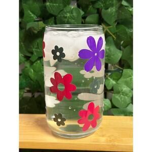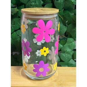 Pink and Yellow Flower Color Changing Glass Can with Bamboo Lid and Glass Straw 16oz Summer, Gift Ideas, Keepsakes