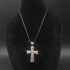 This necklace features a 2.25" L x 1.25" W silver tone cross with pink zebra jasper gemstones on a 20" L black corded necklace. There's a 2" extender chain to make it longer