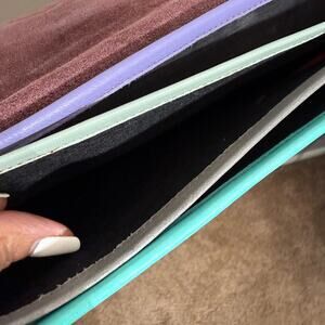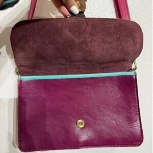 Pink, tan, white, teal and black crossbody purse in excellent preowned condition.