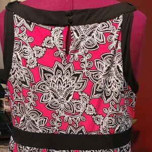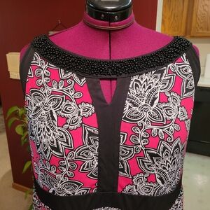 Stylish pink and black floral maxi dress. Features intricate floral patterns and black beading on the neckline.