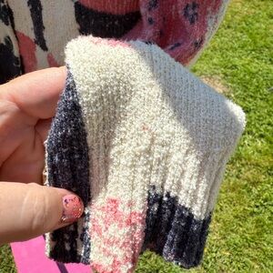 Stay cozy and stylish with the cardigan sweater. Featuring a vibrant mix of pink, black, and cream, this sweater is perfect for any casual outing. The unique pattern adds a touch of flair to your wardrobe. Awesome condition freshly washed and hung dry with free and clear ✨