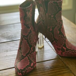 Pink and Black Snakeskin Heeled Boots with Transparent Heel