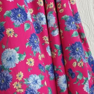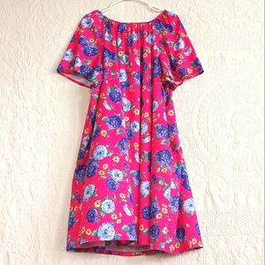 This sundress features a vibrant floral pattern on a bright pink background, accented with shades of blue. Designed with a scoop neck and flutter sleeves, it offers a casual and breezy style perfect for resort wear. The midi length and light fabric make it ideal for warm weather outings.