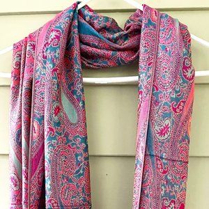 A gorgeous, light-weight yet warm pashmina scarf in pink and teal blue adorned with paisley print all over the scarf. Perfect for any occasion and a great gift for anyone.
