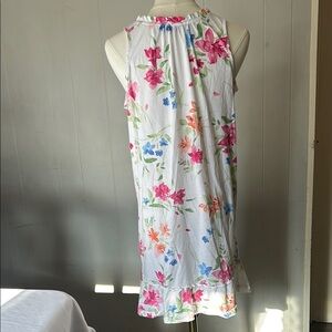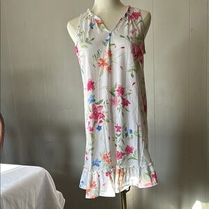 This sleeveless sundress features a playful ruffled and tiered design, perfect for casual or resort wear. The halter neckline adds a touch of elegance, while the pink and blue hues create a vibrant look. Ideal for sunny days, this dress offers both style and comfort.