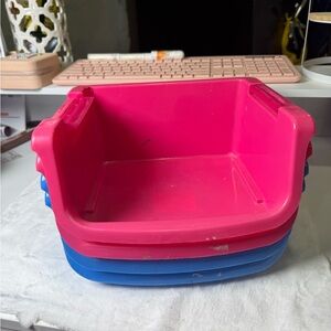 Bright pink and blue stackable storage bins. Perfect for organizing. They all stacked on top of each other. They all work. And I think I found an extra one that I can ship with this too