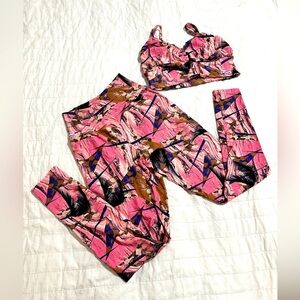 Stylish two-piece set with a vibrant abstract print. Features a pink and brown color scheme.