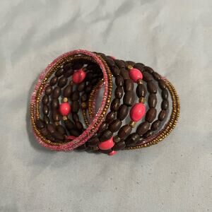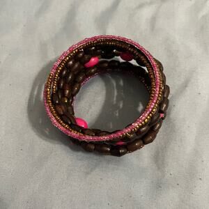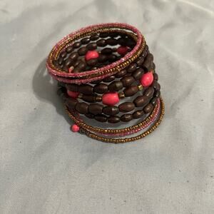This bracelet is made of wooden pink and brown beads and is a layered spiral. The combination of pink and brown beads creates a visually appealing contrast. The wooden material gives the bracelets a natural and rustic look, while the beads add a touch of color and texture. Overall, this bracelet would make a stylish and unique accessory.