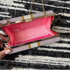 Stylish pink and gold beaded clutch bag perfect for a night out. Features a unique design with intricate beadwork. Elevate your outfit with this chic accessory.