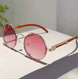 These sunglasses feature a gold-tone metal frame paired with gradient pink lenses, offering a chic retro-inspired look. The round shape and stylish detailing make them a standout accessory for any occasion.