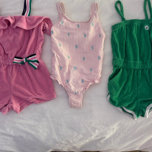Set of pink and green baby rompers. Features cute bow and floral details. Perfect condition