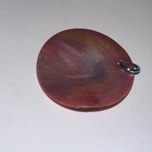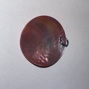 This round disc pendant is made out of Black Lip Shell. It is a Pink/rose color the top is like a light lime green shifting white color and the iridescent nature of it causes it to change color in different light. I used a blue anodized aluminum jump ring as a bail.