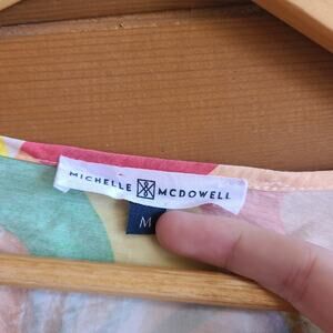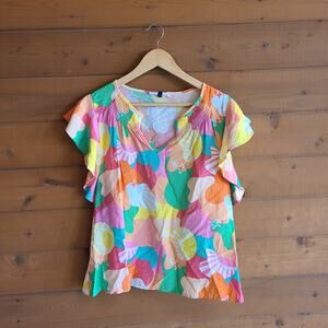 This top features a vibrant pink and green graphic design, offering a boxy silhouette with cap sleeves for a relaxed fit. The artistic pattern adds a playful touch, making it a standout piece for any casual occasion.