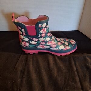 These charming ankle booties feature a delightful floral pattern in pink and green, perfect for brightening up rainy days. Made from durable waterproof material, they offer both style and practicality. The short shaft height ensures comfort and ease of movement, making them ideal for gardening or wet weather adventures. bundle more items for bigger deals Bin-149
