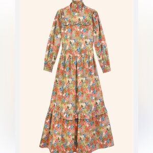 This elegant gown features a beautiful blend of pink and green hues, perfect for a wedding guest occasion. The long bishop sleeves and mock neck add a touch of sophistication, while the flowing skirt creates a graceful silhouette. Crafted from lightweight fabric, this dress offers both comfort and style.