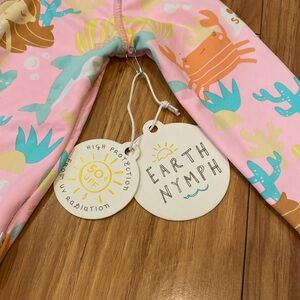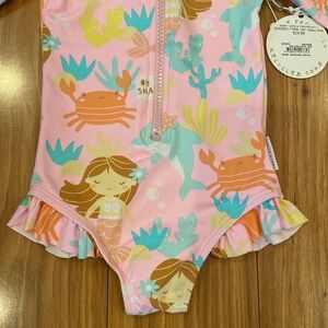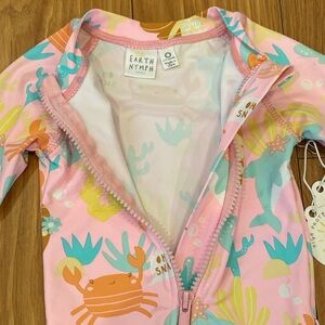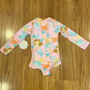 This vibrant rashguard swimwear features a delightful pink and green color scheme, offering excellent sun protection with its long sleeves and high neckline. The tropical pattern adds a playful touch, making it perfect for sunny beach days. Fits baby girl 0-12 months. BRAND NEW WITH TAGS!