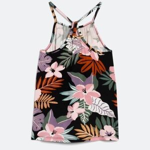 This vibrant tank top features a bold tropical print with pink flowers and green palm leaves, perfect for warm weather. The sleeveless design and lightweight fabric make it ideal for staying cool and stylish. Its eye-catching pattern adds a touch of the tropics to any outfit.
