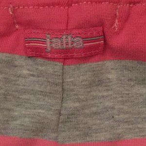 T-shirt material, so super cozy. Short shorts in pink and grey stripes. Elastic waistband with drawstring tie. Jaffa by OinkBaby