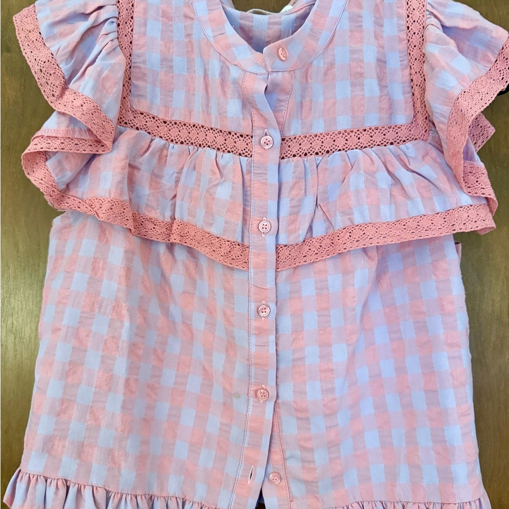 Adorable ruffle top in pink and lavender with check pattern. Pink lace trim. Perfect for any occasion with its charming design.