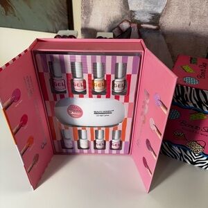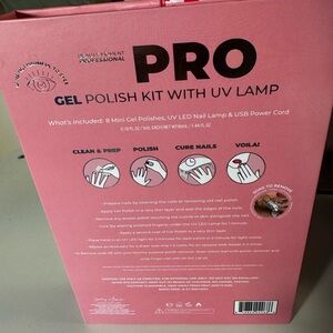 Vibrant gel polish kit featuring pink and orange colors. Includes a UV lamp for professional results.