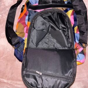 This vibrant backpack showcases a bold geometric pattern in pink and orange, offering a playful yet stylish look. Its durable material and contemporary design make it perfect for everyday use, while the retro-inspired aesthetic adds a unique touch.