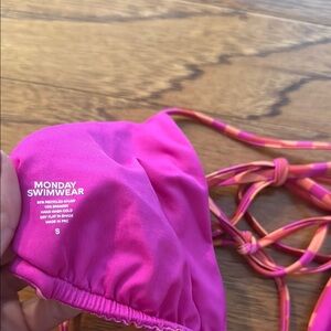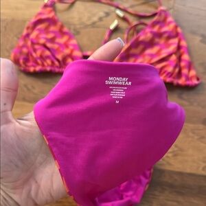 Stylish bikini set with a vibrant pink and orange geometric pattern. Perfect for beach days.